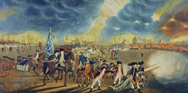 Love this portrait of Washington representing his twin victories of Trenton and Princeton. Leaning on the captured cannon, captured colors at his feet. A Marvelous smile on his face. Yes, I saved the revolution, and proved my critics wrong.Eye witness panting of the Battle. Great details for uniforms, colors.