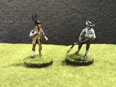 Got the paint and brushes out and have been painting some of the civilian figures I got at Historicon. I like to set up little vignettes on my battle fields to liven things up. Animals like cats chasing mice, dogs, or foxes in the woods. Geese causing mischief. And of course civilians going about their business. Or tying to.....