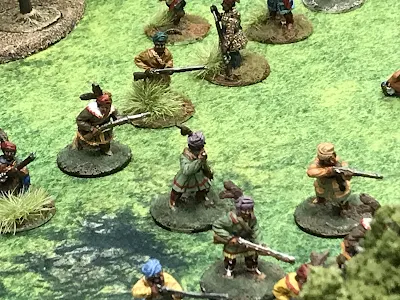 The first couple turns saw the Regulars and Militia struggle through the terrain. Once across the swamp and into the open ground that changed. The Seminoles rolled high and got three operations. so we got to fire, reload and fire again. I smashed the militia skirmish line in front of me and George shot up one company of regulars.