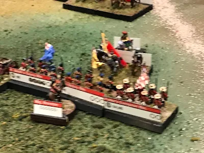 John, who hosted the game has made it visually interesting. He took and Xeroxed the card board counter. These were cut out and glued to magnetic bases. He then painted 1:48000 scale ships and glued them to the counters. You now have a visually pleasing game which plays simply but looks good. Outstanding! Rules used were right out of the box which provided a simple but enjoyable game.