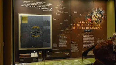 "after being hidden away for more than two centuries, this flag is on public display at the Museum for the first time since it flew over the regiment during the Revolutionary War. The newly discovered flag is one of fewer than half a dozen surviving Revolutionary War flags from the South. The regimental flag of the 2nd Spartan Regiment marked its position on the battlefield. The flag shows a “spartan dog” as well as a rattlesnake. The dog symbolizes a bloodthirsty man, from a reference in Shakespeare’s Othello. The snake appears in many Middle and Southern colonial images as an American symbol of defense. Revolutionaries often used the rattlesnake to symbolize American resistance, but questions remain about the meaning of the snake and the dog. Does the snake represent American resistance and unity or the British threat? Does the Spartan dog represent scrappy South Carolinians or bloodthirsty redcoats and loyalists?"